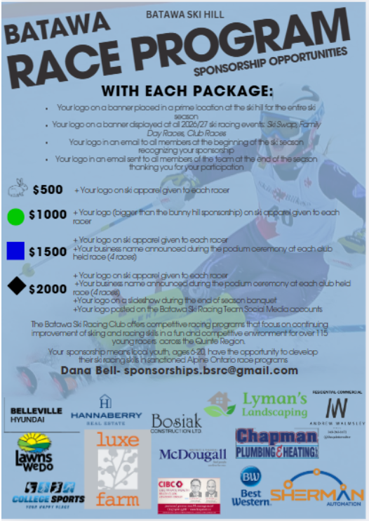 Sponsorship plays a critical role in supporting the continued growth of the Batawa Ski Race Program. Our sponsors help offset athlete costs, enhance training and racing opportunities, and strengthen the overall experience for our racers and families.
